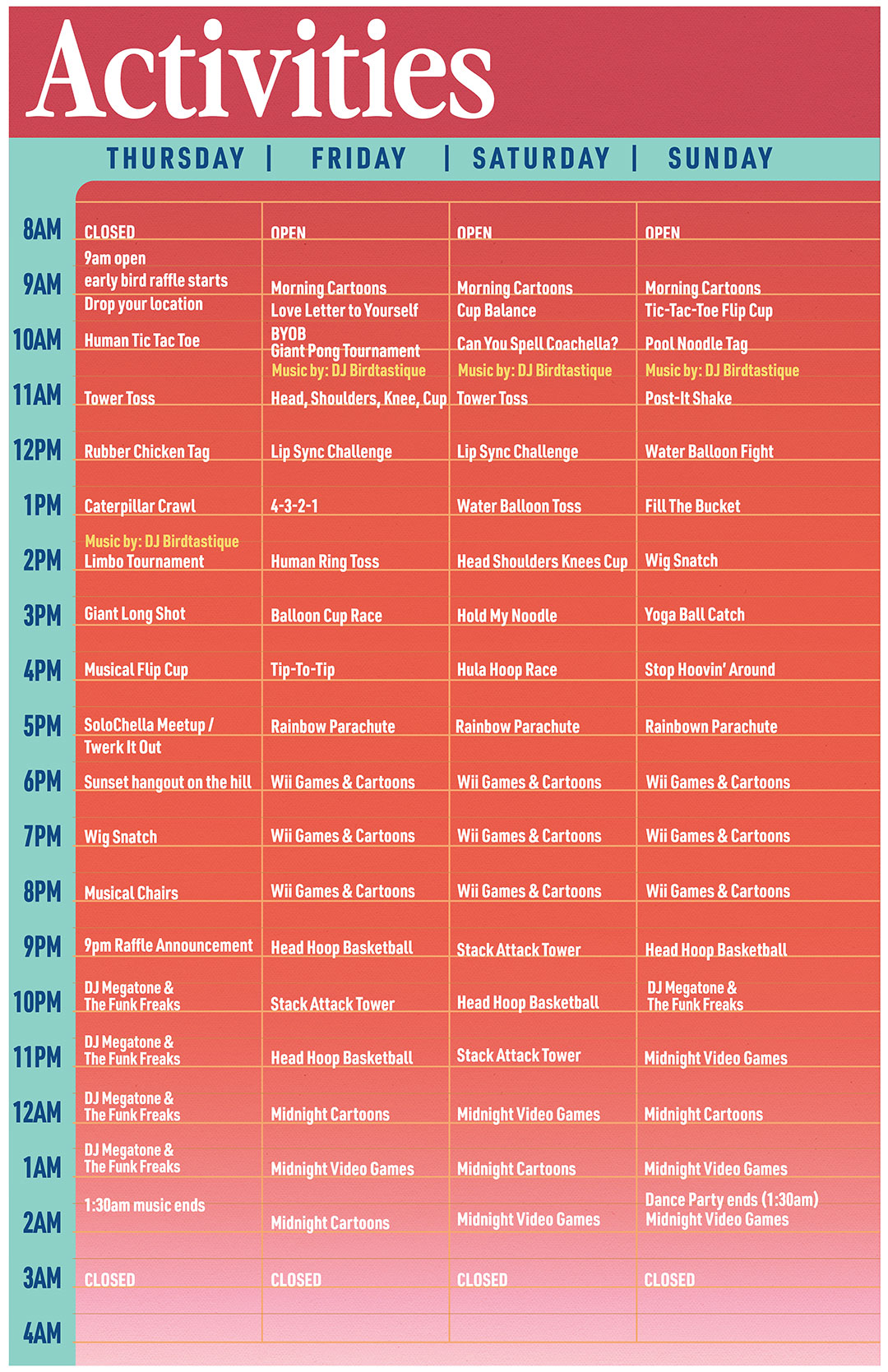 *times & activities subject to change