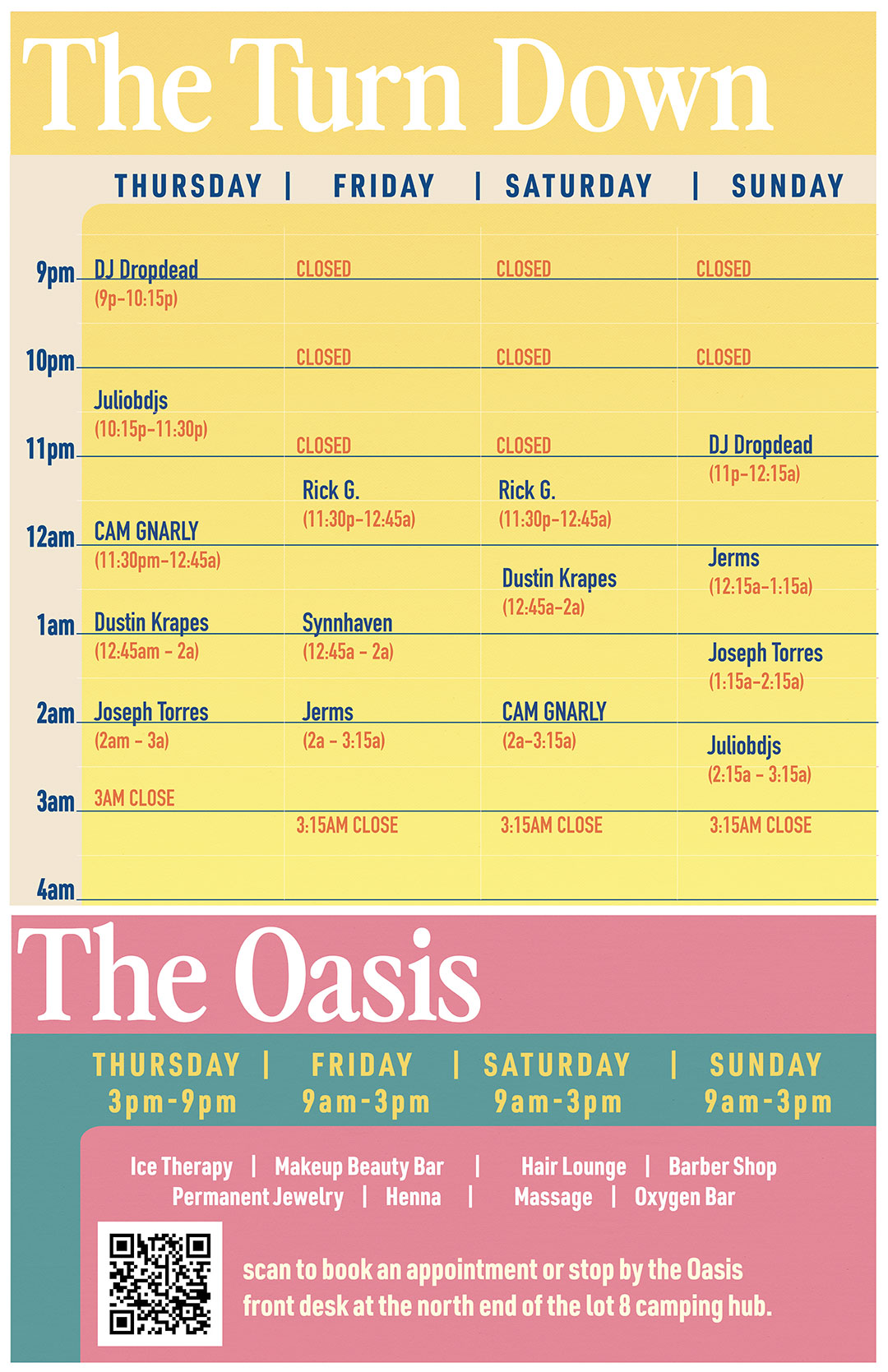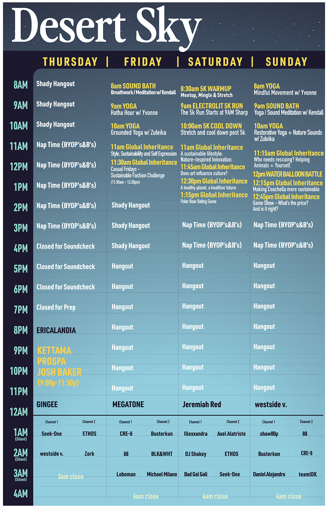 Explore our full schedule of yoga, sound baths, and fitness challenges to keep your body fueled and your spirit high all weekend long.